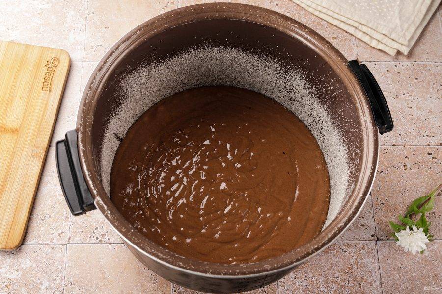 Форму для запекания смажьте маслом, дно и бока присыпьте мукой или манкой. Я буду печь в мультиварке, но вы можете приготовить пирог и в духовке. Вылейте тесто. Если готовите в мультиварке, готовьте на режиме "выпечка" до звукового сигнала. Если будете печь в духовке, готовьте около 40 минут. Готовность проверяйте зубочисткой или деревянной шпажкой, проткните пирог по центру, если шпажка сухая — пирог готов.