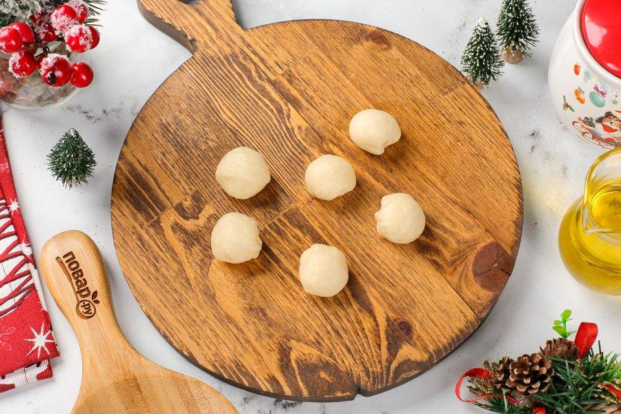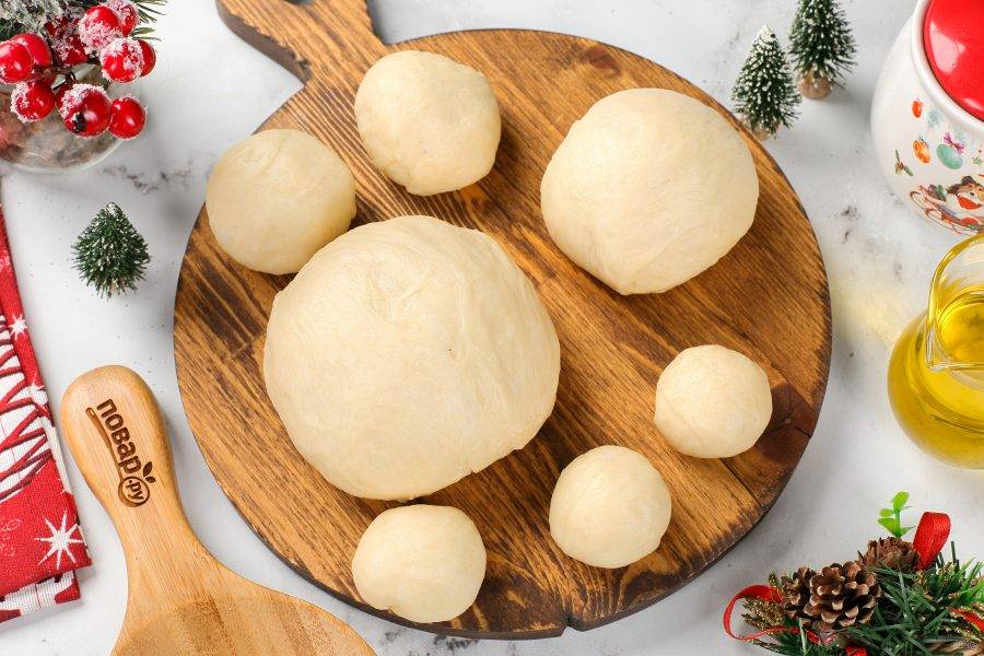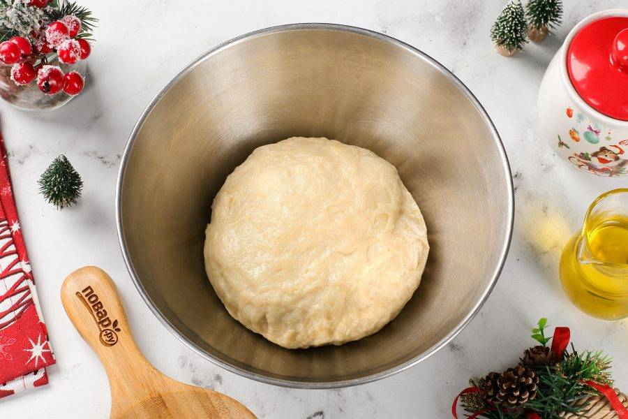 Готовое тесто должно быть чуть липкое, но в то же время мягкое и пластичное. Соберите его в шар, смажьте растительным маслом, накройте миску пищевой плёнкой и оставьте в тёплом месте примерно на 1,5 часа.