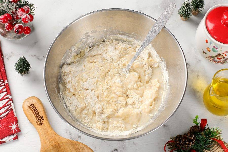 Затем частями добавьте муку. У меня обычно уходит 350-400 грамм, но может понадобиться и чуть меньше или больше.