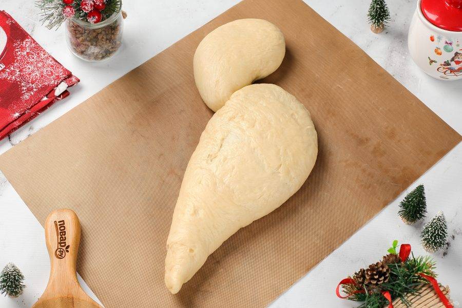 Теперь необходимо тесто разделить на части. Часть побольше оставьте для туловища. Одна часть поменьше — это будет заготовка для головы. Две части чуть поменьше — крылья. И три части примерно одного размера — кончик хвоста и ноги.