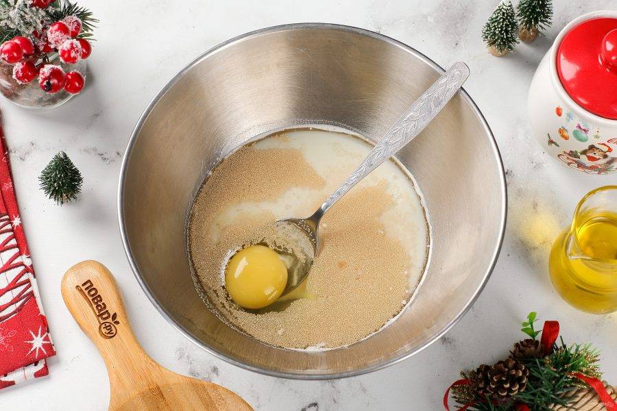 Соедините тёплое молоко, растительное масло, сахар, соль, яйцо и дрожжи.