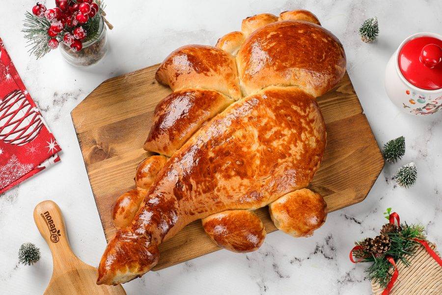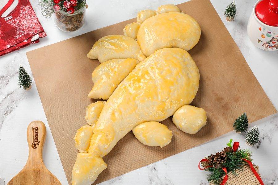 Накройте пирог полотенцем и оставьте на 20 минут, после чего смажьте желтком. Выпекайте в духовке при температуре 180 градусов около 40 минут, пока верх не подрумянится.