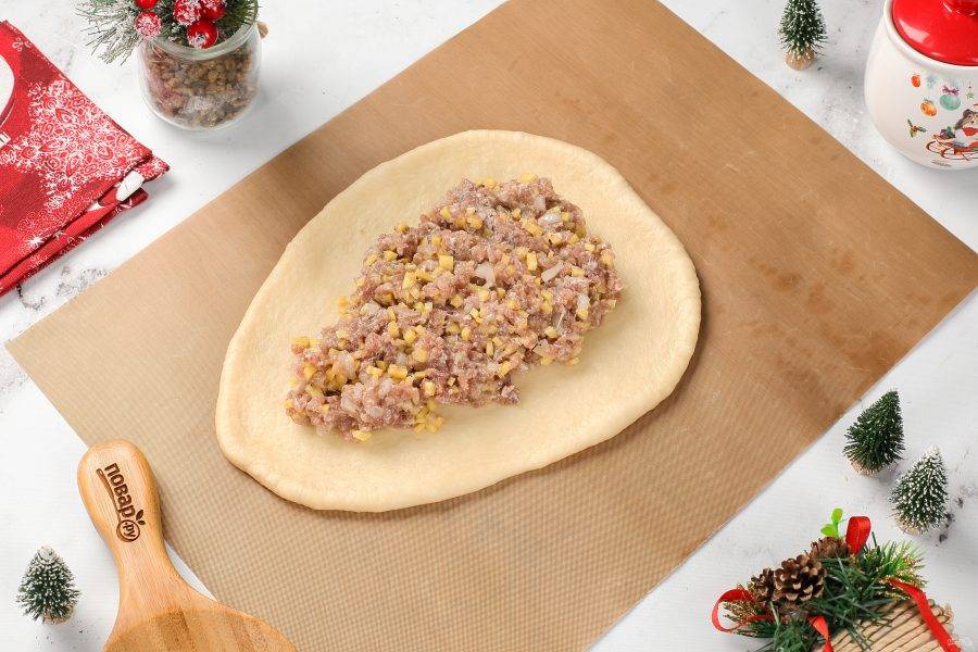 Раскатайте самую большую часть, примерно как на фото и выложите начинку. Рекомендую пирог выпекать на специальном коврике или использовать хорошую пекарскую бумагу. Поэтому раскатывать тесто можно сразу на ней.
