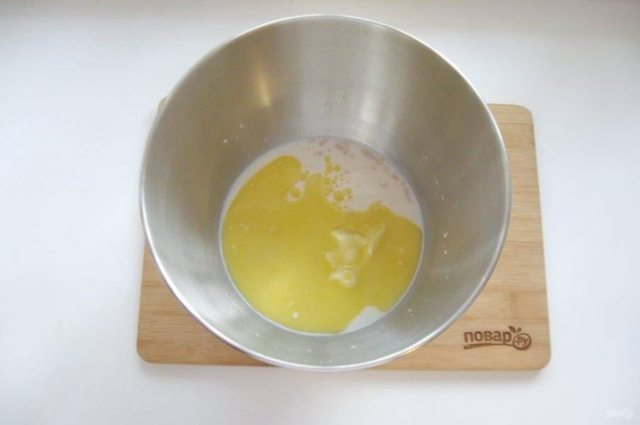 Растопите сливочное масло, немного охладите и добавьте в тесто.