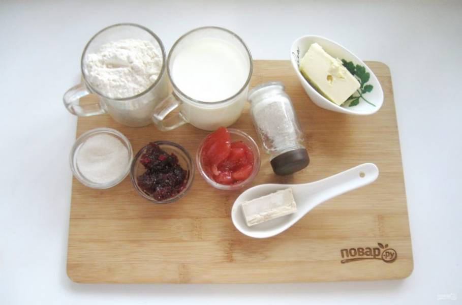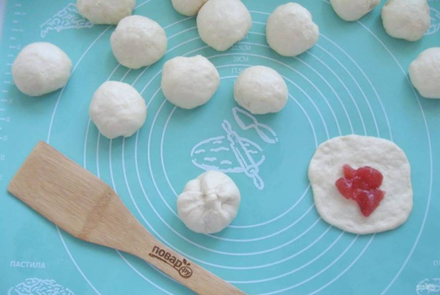 Каждый шарик раскатайте в лепешку, в середину которой выложите вишневый и земляничный джем.