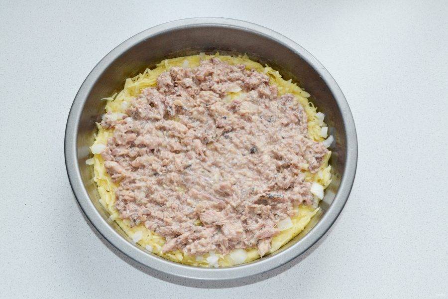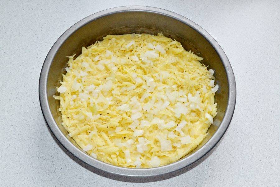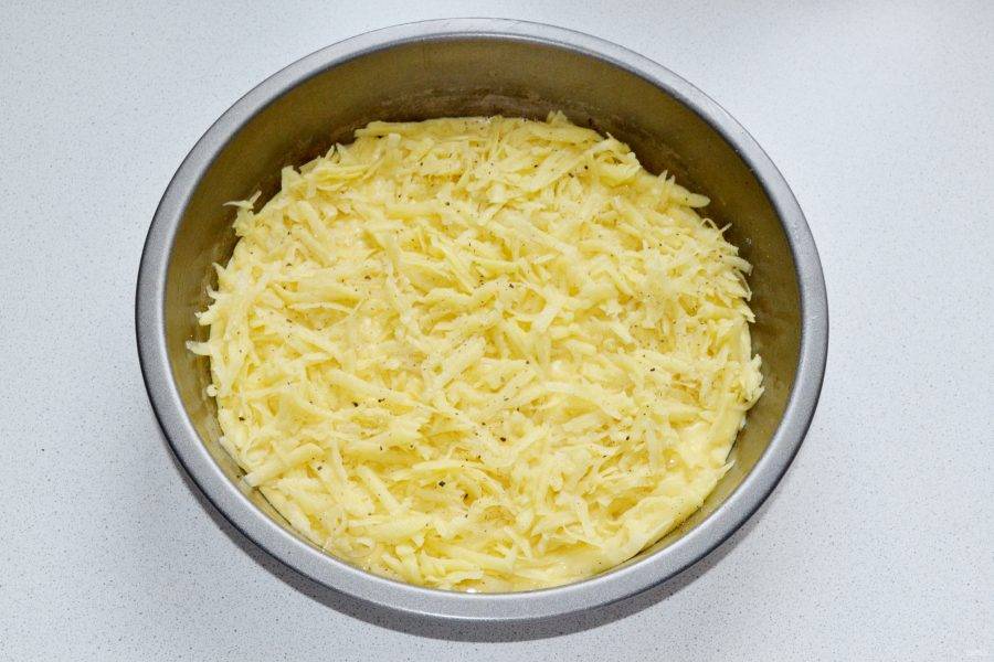 Вылейте половину теста в жаропрочную форму. Сверху выложите тертый картофель.