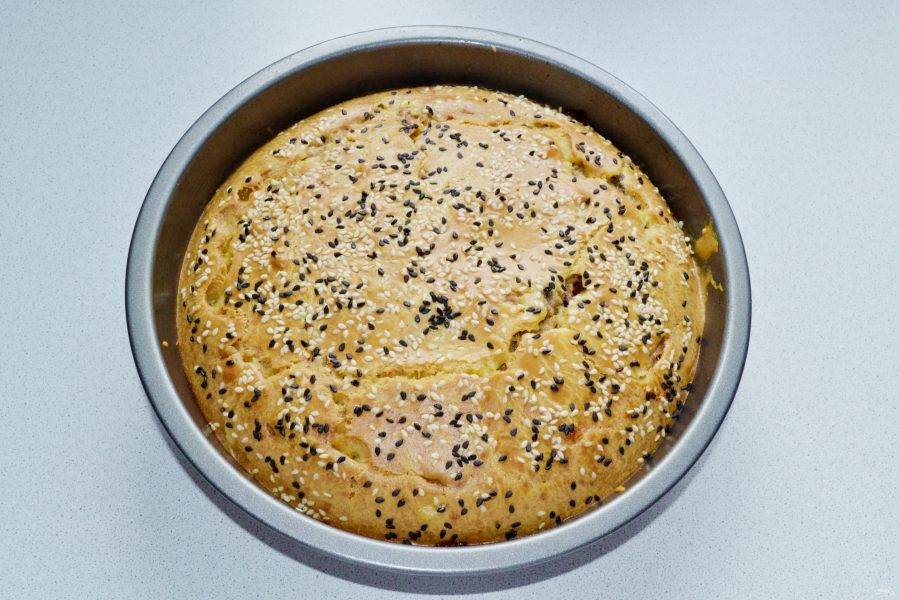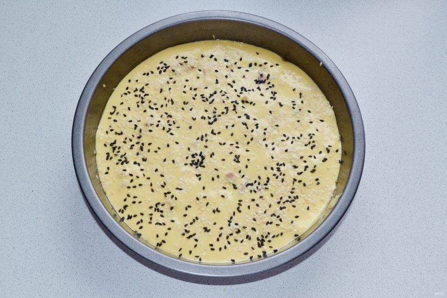 Вылейте аккуратно сверху вторую половину теста. По желанию пирог можно присыпать кунжутом. Отправьте в разогретую до 180 градусов духовку.
