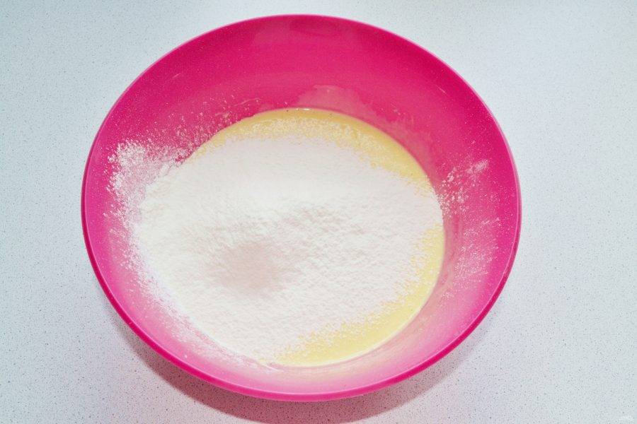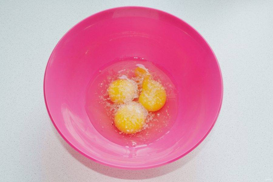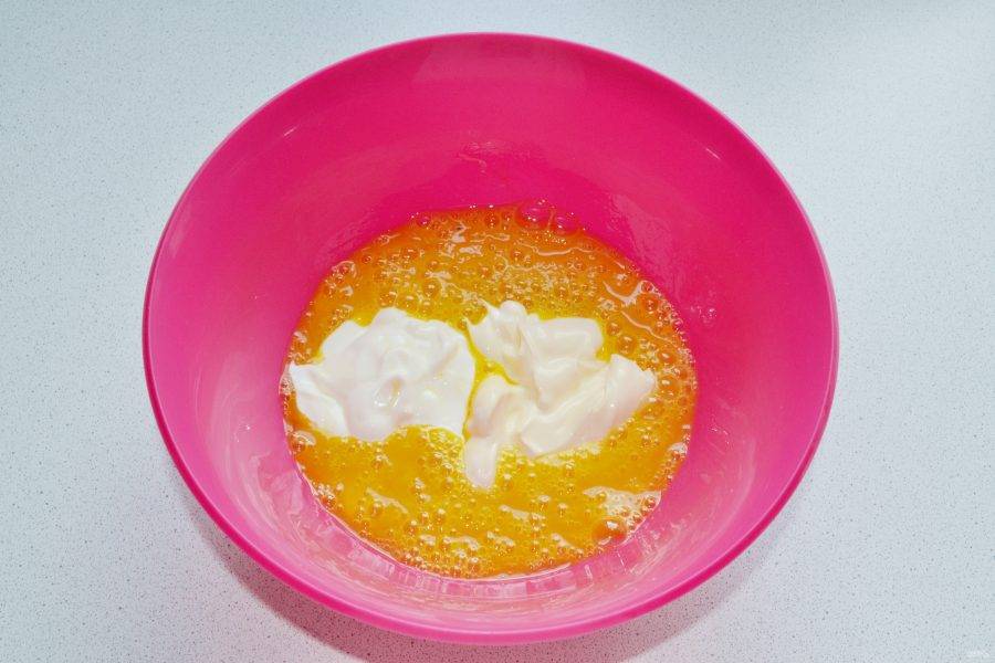Для начала займемся тестом. В глубокую мисочку вбейте яйца. Добавьте соль по вкусу.