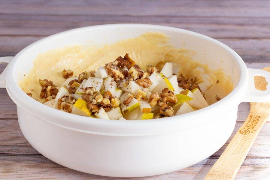 Груши помойте, очистите от сердцевины. Половину одной груши отложите для украшения пирога. Остальное нарежьте на небольшие кусочки. Орехи разломите на кусочки и аккуратно вмешайте в тесто.