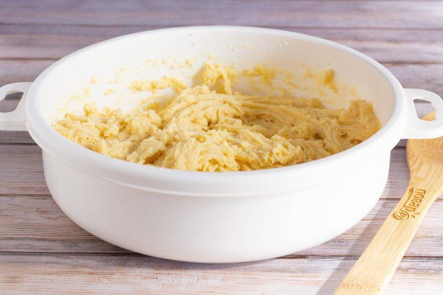 Форму для выпечки (20-22 см) смажьте растительным маслом и слегка присыпьте мукой или панировочными сухарями. Выложите тесто в форму.