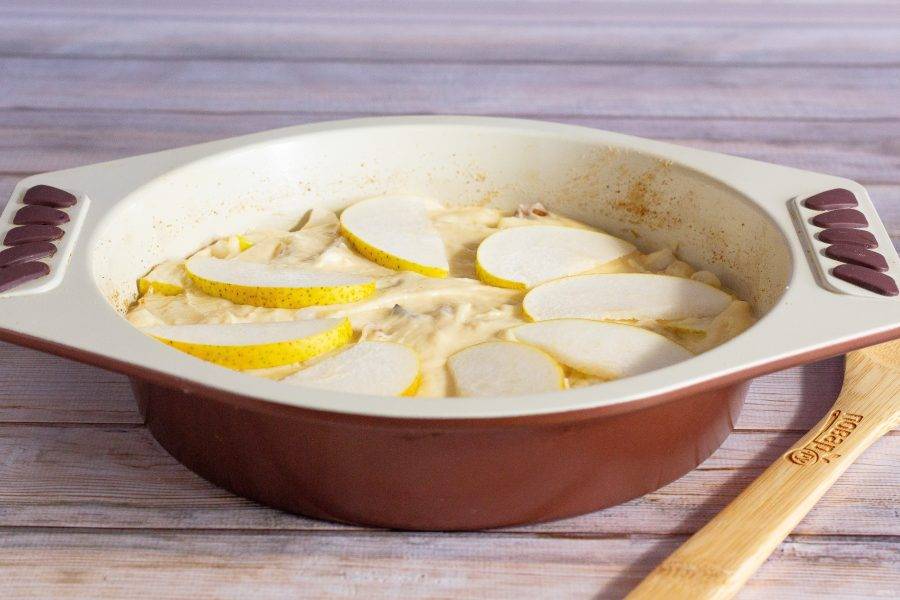 Отложенную половинку груши разрежьте на тонкие дольки и выложите сверху на тесто. Поставьте выпекаться в разогретую до 190 градусов духовку на 55-60 минут.