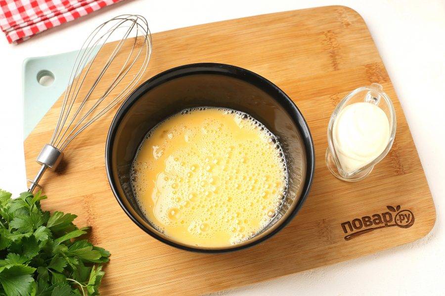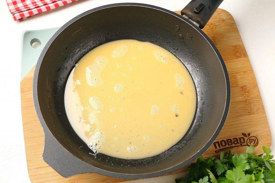 Сковороду смажьте маслом, убавьте огонь до минимума и вылейте половину порции взбитых яиц.