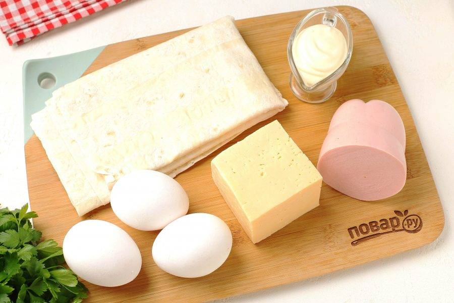 Ленивый пирог из лаваша с сыром и колбасой на сковороде готов.