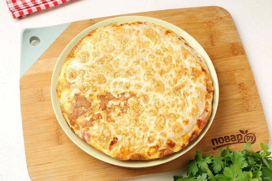 Сверху всё залейте остатками взбитых яиц. Накройте крышкой и готовьте на небольшом огне около 5 минут.