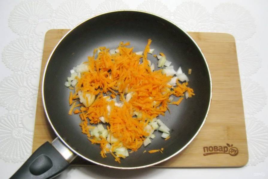 Приготовьте начинку для пирога. Морковь и репчатый лук очистите, помойте. Лук мелко нарежьте, а морковь натрите на терке. Выложите в сковороду.