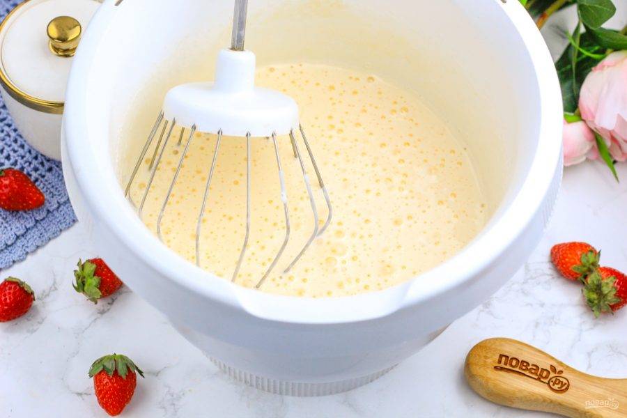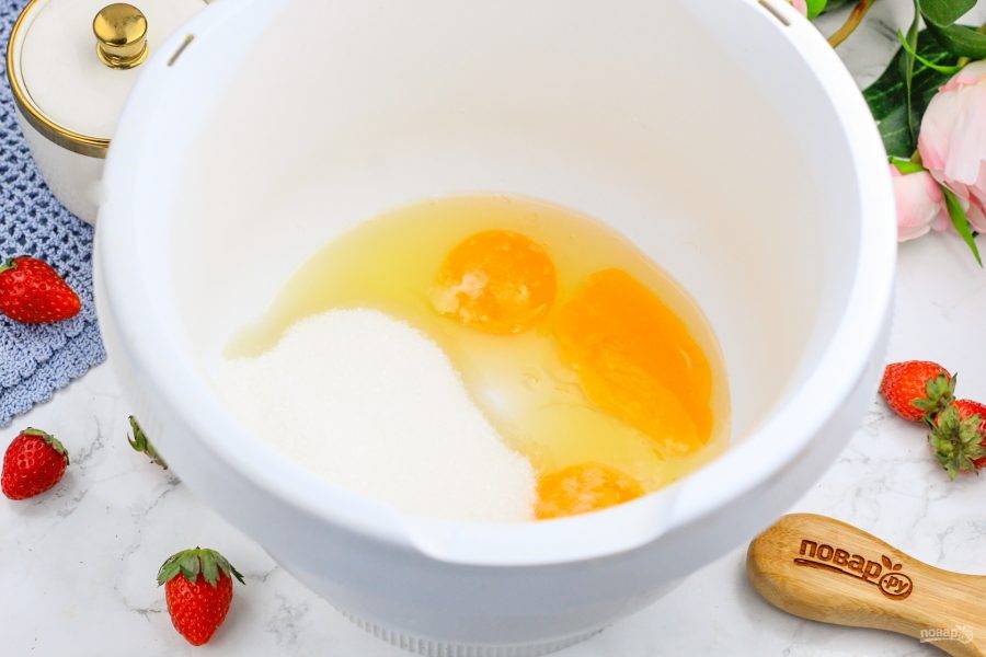 Куриные яйца взбейте в чаше кухонного комбайна с солью и сахарным песком в пышную пену примерно 3-4 минуты.