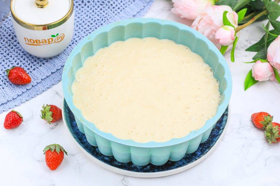 Смажьте дно формы и бортики растительным или сливочным маслом. Разогрейте духовку до 180 градусов. Влейте в форму приготовленное тесто и отправьте ее в духовку на средний ярус техники.