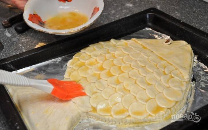 Остатки теста раскатайте, вырежьте из него хвост и чешую, используя круглую форму. Смажьте "детали" взбитым яйцом.