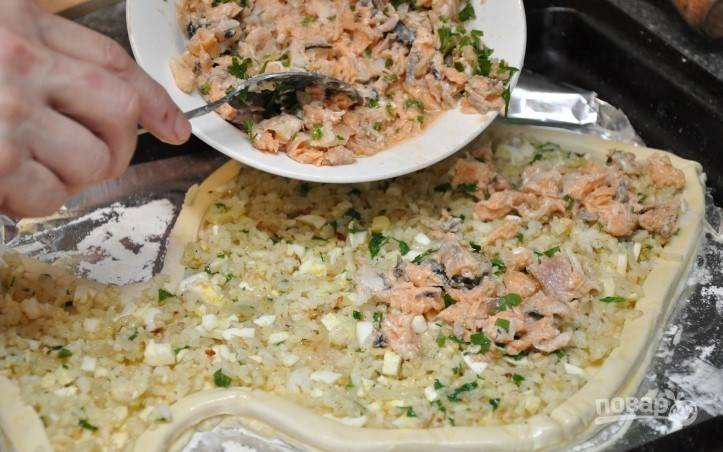 Рыбку переложите на противень, застеленный фольгой. Обжарьте на сливочном масле лук, отварите рис до полуготовности. Затем сварите вкрутую яйца, очистите их и измельчите. Смешайте все ингредиенты, посолите и поперчите начинку. Выложите ее в рыбку из теста. Сверху положите рыбную крнсерву, размятую вилкой и смешанную с зеленью.