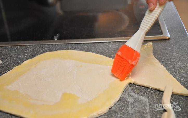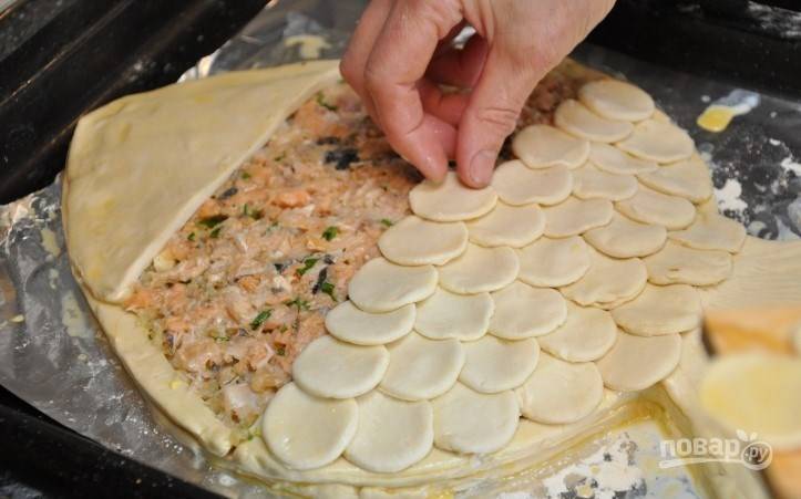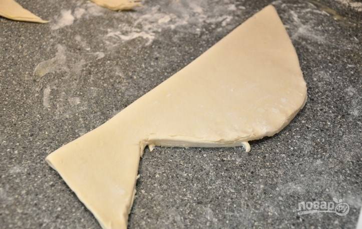 Разморозьте слоеное бездрожжевое тесто при комнатной температуре, присыпьте его мукой и сложите вдвое. Вырежьте из теста половинку рыбки.