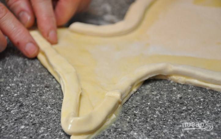 Остатки слоеного теста нарежьте на тонкие полосочки около сантиметра шириной. Выложите из полученных кусочков бортики по краю рыбки.