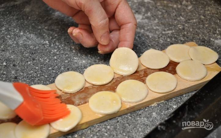 Разверните тесто так, чтобы рыбка получилась целой. Взбейте сырое куриное яйцо вилочкой и смажьте края рыбки из теста.