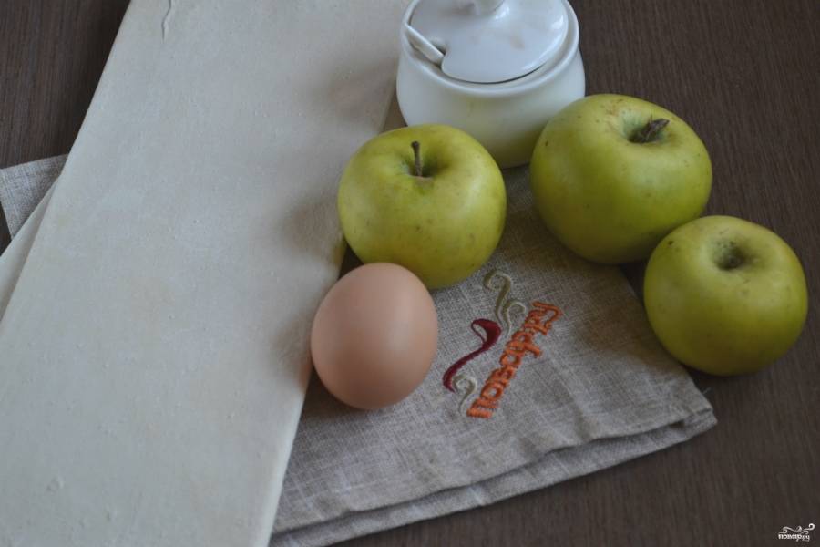 Для приготволения пирога с яблоками вам понадобится два прямоугольных листа готового слоеного бездрожжевого теста, несколько яблок кислых сортов, сахар и яйцо.