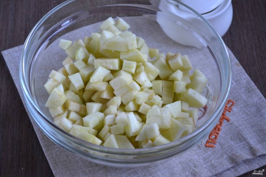 Яблоки очистите и порежьте мелкими кубиками. Чтобы они не потемнели, сбрызните их 1 ч. ложкой лимонного сока.
