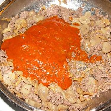 Рецепт приготовления пирога из спагетти, говяжьего фарша, помидоров, сметаны и сыра.