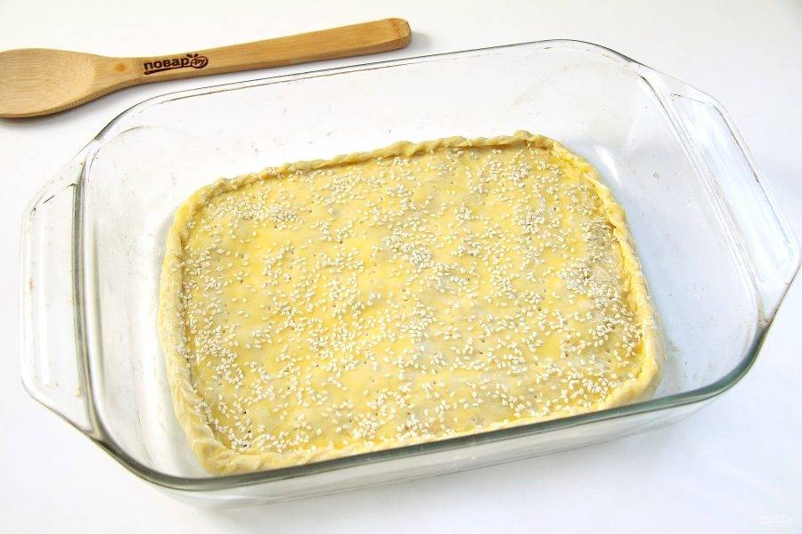 Соедините края теста любым удобным способом. Смажьте верх яичным желтком и наколите вилкой. Посыпьте по желанию пирог кунжутом. Выпекайте при температуре 180 градусов около 30 минут.