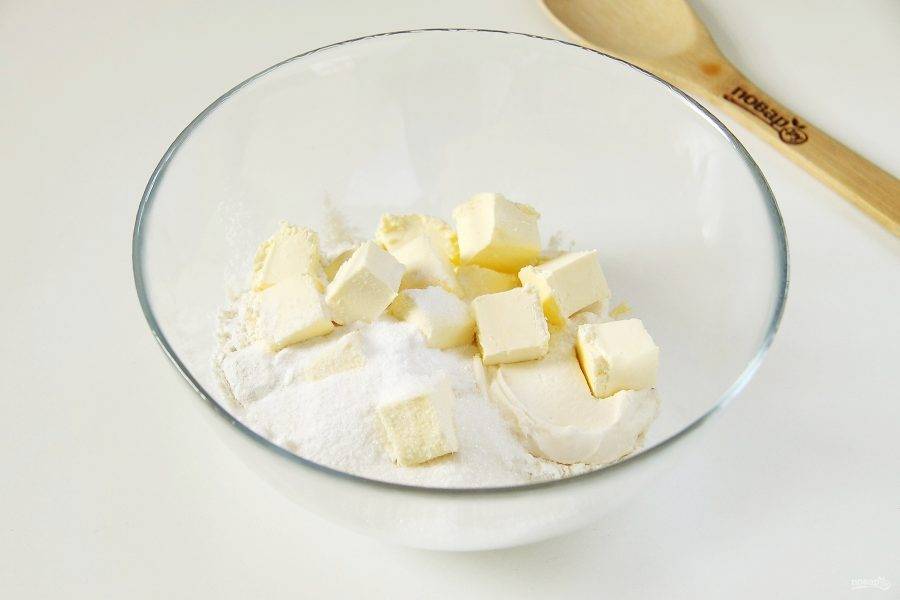 Соедините в глубокой миске муку, нарезанный кубикам мягкий маргарин, сметану, соль, сахар и соду.