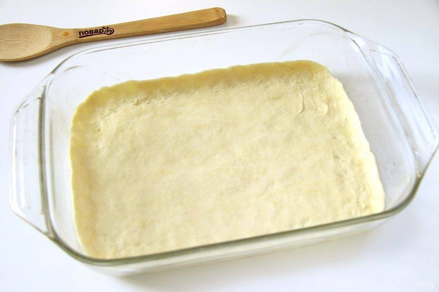 Разделите тесто на две части. Одна должна быть чуть больше, вторая немного поменьше. Большую часть раскатайте на присыпанной мукой поверхности в форме прямоугольника, толщиной примерно 3 мл. Аккуратно перенесите раскатанный пласт теста в смазанную маслом форму для выпечки. Руками сделайте небольшие бортики.