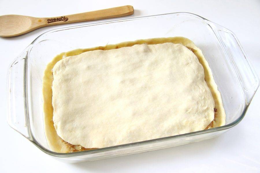 Вторую часть теста так же раскатайте в форме прямоугольника и накройте им начинку.