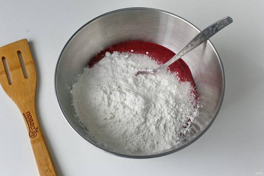 Переложите ягодную массу в глубокую миску, добавьте оставшийся сахар и крахмал.
