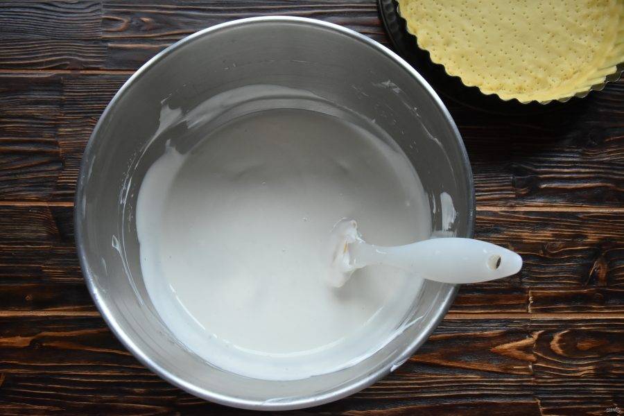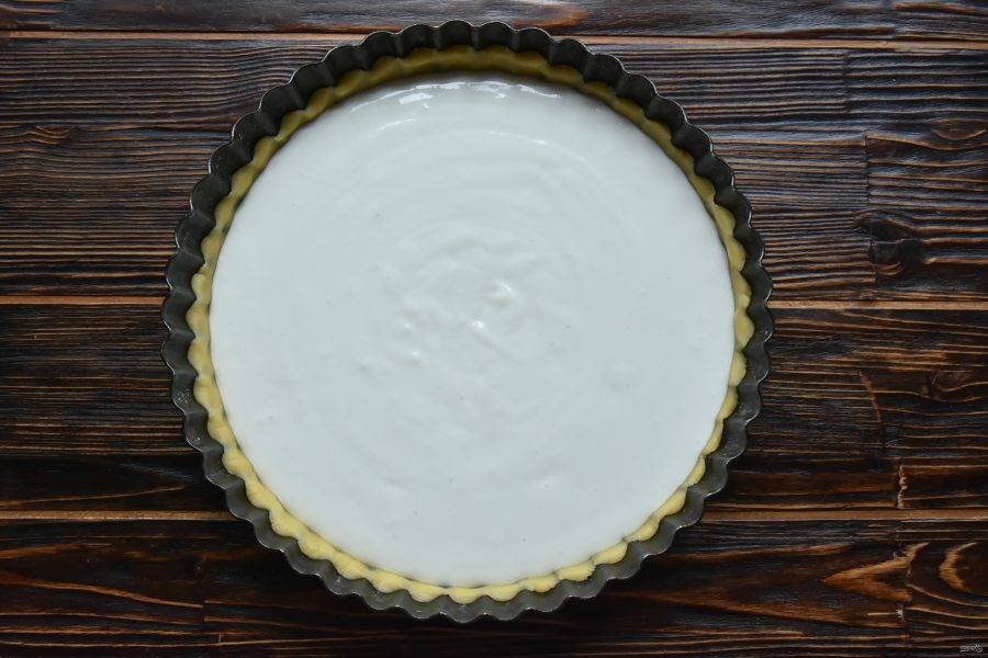 Пока тесто охлаждается подготовьте начинку. Для начинки используйте сметану 15-25% жирности. Регулируйте количество сахара по своему вкусу. Вместо смеси для пудинга можно взять кукурузный крахмал.