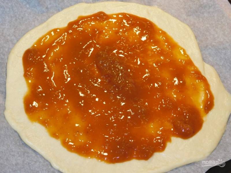 2/3 теста раскатайте в лепешку и выложите на противень для выпечки. Выложите варенье, не доходя до краев.