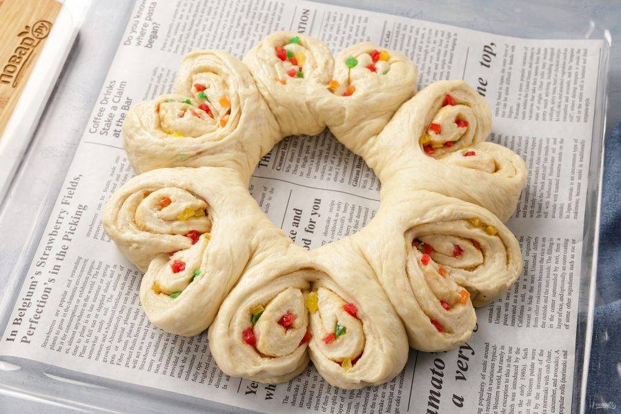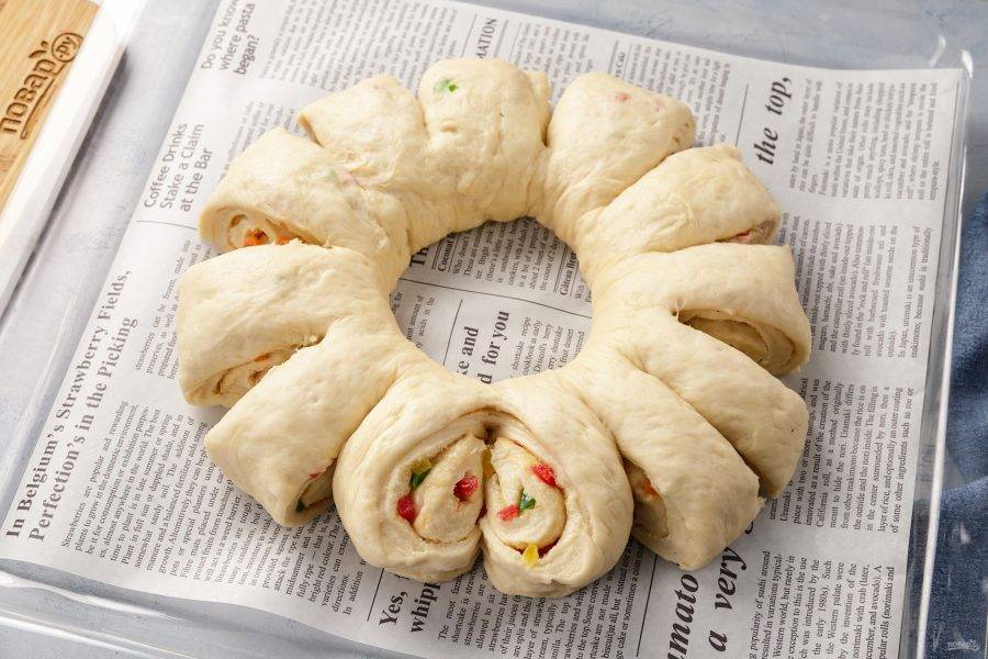 Каждую часть теста разделите на 3–4 сегмента, не разрезая до самого конца. В итоге у вас должно получиться чётное количество сегментов. Аккуратно поднимите соседние части теста и разверните их в противоположные стороны так, чтобы срез оказался сверху. В результате форма будет напоминать сердечко, похожее на булочку-плюшку, а готовый пирог будет выглядеть как венок.