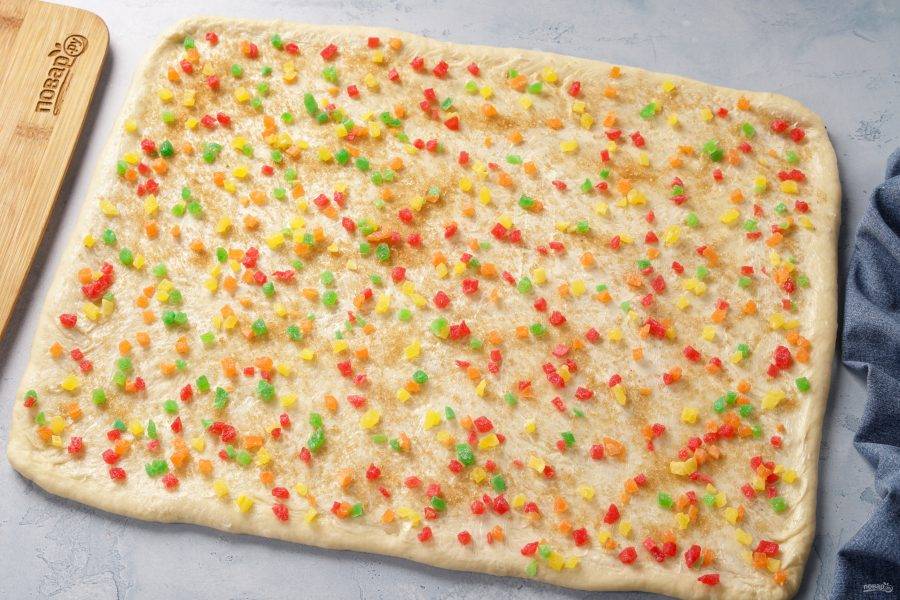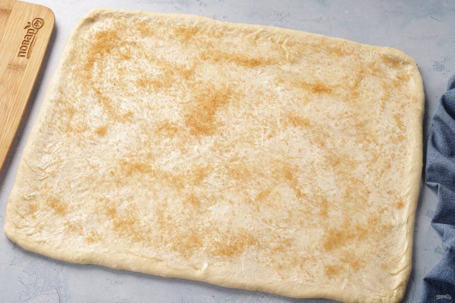 Смажьте тесто мягким сливочным маслом и присыпьте равномерно сахаром. Тростниковый сахар можете заменить на обычный.