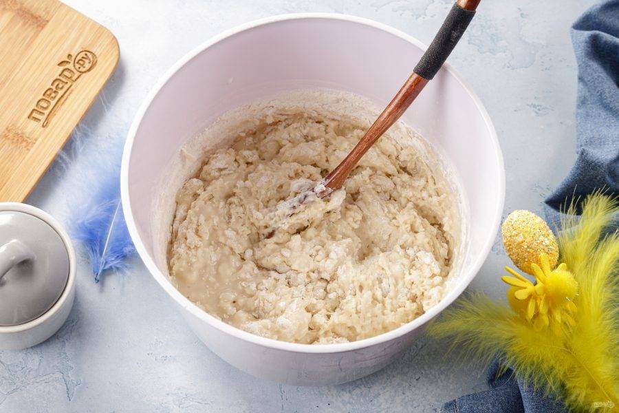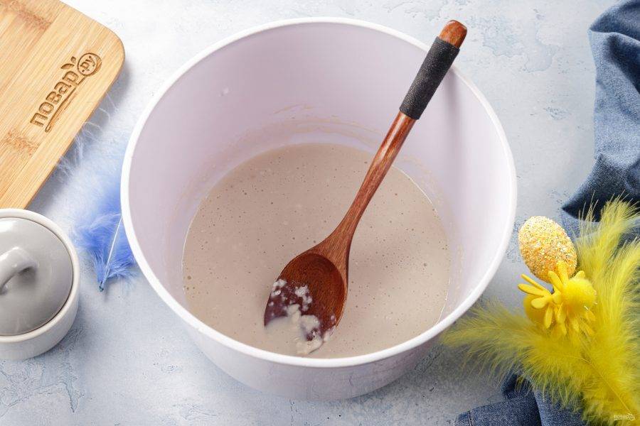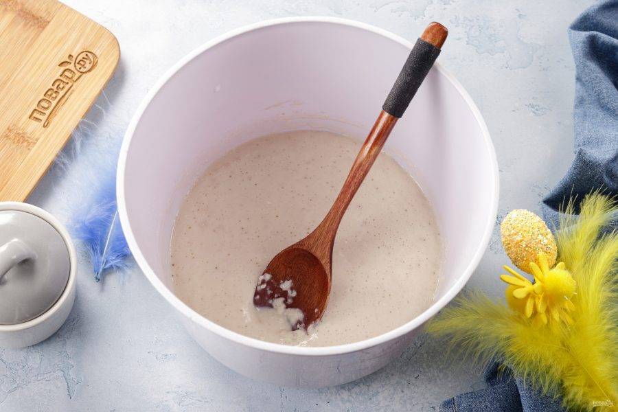 В результате должна получиться масса, похожая по консистенции на жидкую сметану. Накройте миску с опарой лёгким полотенцем и оставьте в тёплом месте на 15–20 минут, чтобы она поднялась.