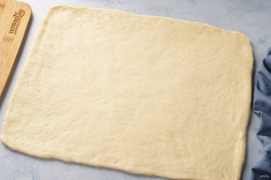 Осторожно обомните тесто и выложите его на слегка присыпанную мукой поверхность. Раскатайте в прямоугольный пласт толщиной примерно 0,5 см.