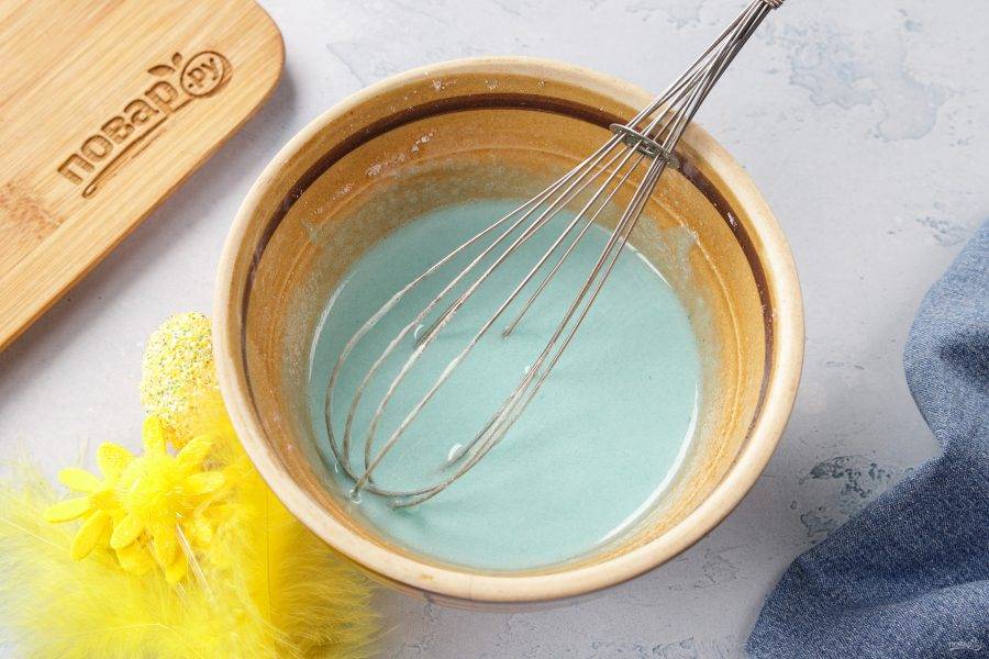 Если хотите, украсьте пирог глазурью. Для этого просейте сахарную пудру, чтобы удалить комочки. Яичный белок слегка взбейте вилкой до однородной консистенции, затем добавьте сахарную пудру и перемешайте. Постепенно, по каплям, введите лимонный сок, продолжая растирать смесь до получения нужной консистенции. Глазурь должна быть текучей: если она слишком густая, добавьте немного лимонного сока; если жидкая, подсыпьте ещё сахарной пудры. В завершение я добавила каплю голубого красителя для цвета.