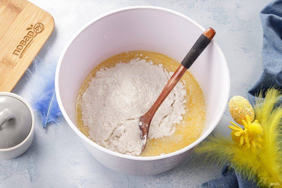 Сначала перемешайте тесто ложкой. Не добавляйте всю муку сразу — её количество может немного варьироваться, поэтому подсыпайте постепенно, чтобы достичь нужной консистенции.