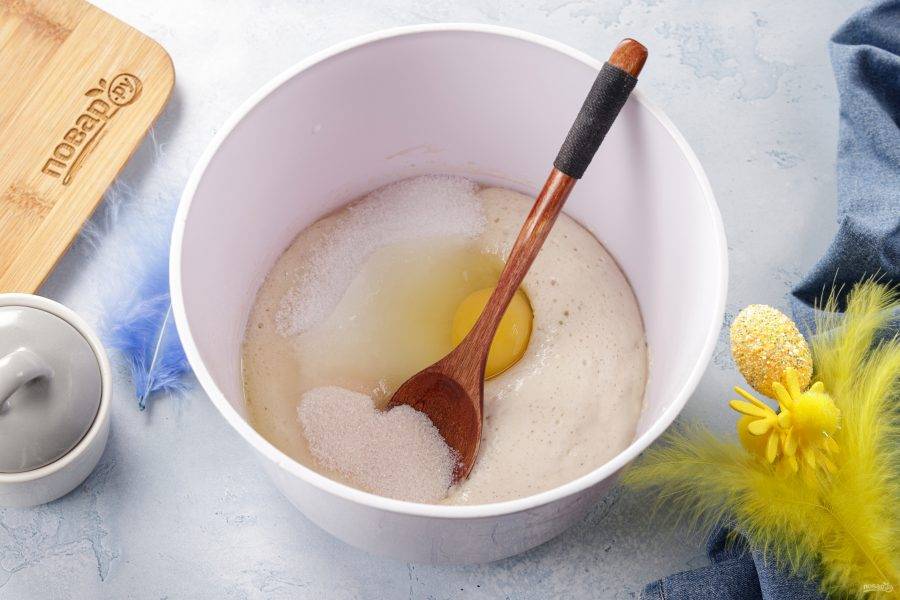 Добавьте яйцо, соль, сахар, ванильный сахар. Перемешайте.