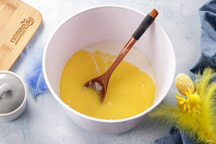 Влейте оставшееся молоко, ряженку и растопленное сливочное масло.