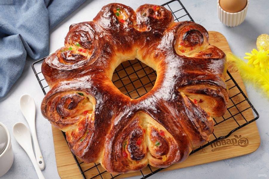 Фигурная выпечка в виде венка идеально подходит для Пасхи, смотрится очень красиво, а справится даже начинающая хозяйка. Яркий, пышный и вкусный пирог — прекрасное дополнение к традиционным куличам.