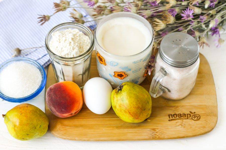 Фрукты промойте в воде, разрежьте груши на четыре части, удалите семенные блоки, из персика удалите косточку. Промойте и нарежьте ломтиками. Выложите на тесто. Разогрейте духовку до 180 градусов. Присыпьте начинку оставшимся сахаром, и поместите форму в духовку.