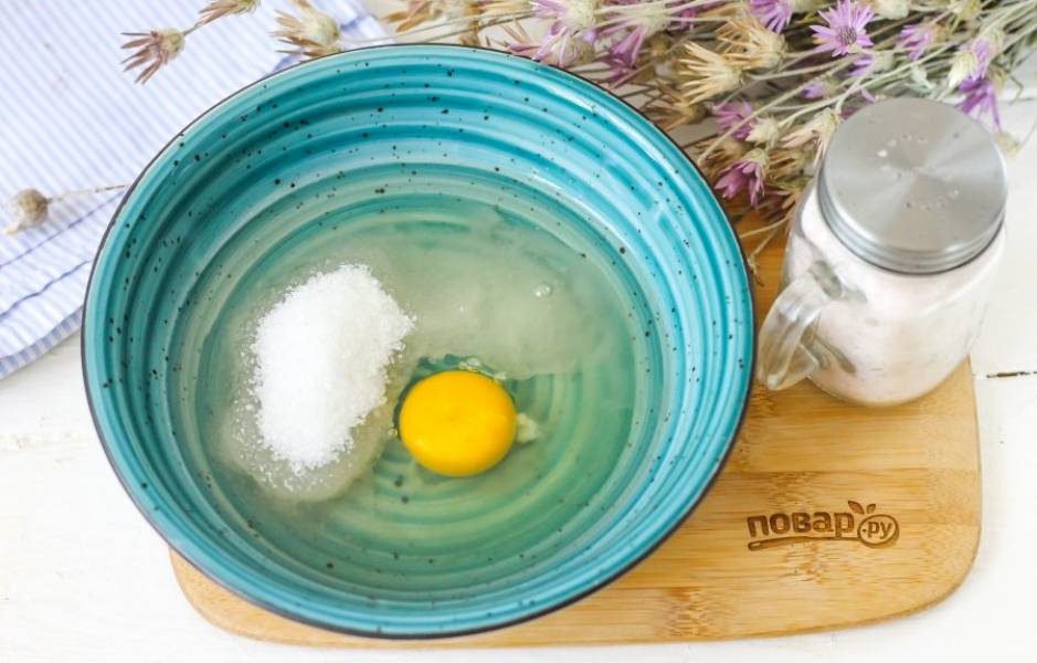 Всыпьте в жир 3 ст.л. сахара, соль и вбейте куриное яйцо. Тщательно все взбейте.