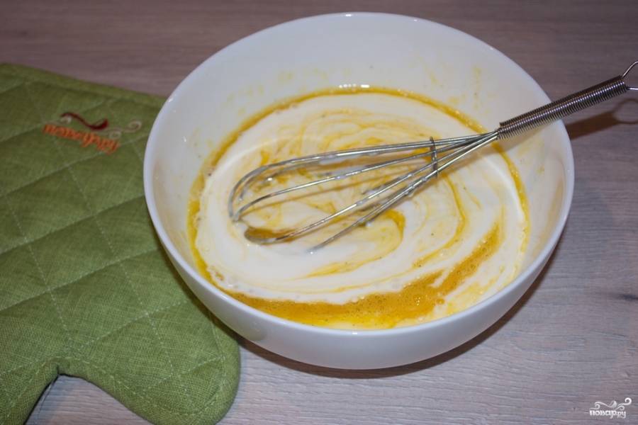 Следом добавьте сметану. Массу взбейте венчиком до однородности.
