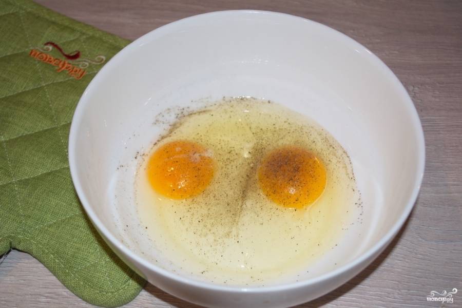 В мисочку вбейте яйца. Добавьте соль, разрыхлитель и специи.