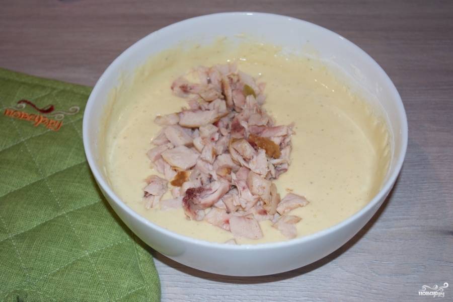 Куриное мясо нарезаем небольшими кусочками. Чем мельче мы его нарежим, тем приятнее будет его кушать в готовом пироге.